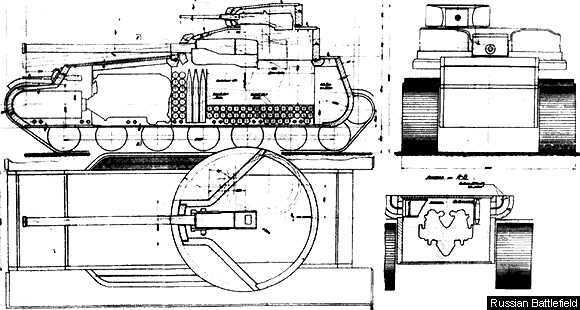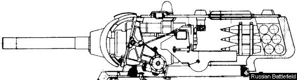 Only engineer N. Tseits rejected the mounting of a second gun. He suggested the mounting of the 107 mm Cannon in a standard tank turret, laying it out in circular form so that the entire basic load of 120 fixed rounds were stowed along the walls of the cylindrical turret. This design stood out for its originality and in the future created fertile soil for employment of an auto-loading mechanism.