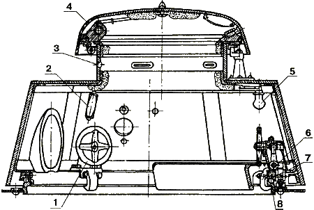 | 1. Turret brake; 2. Handle for rotating turret; 3. Vision slit; 4. Cupola hatch cover; 5. Cupola hatch cover handle; 6. Turret race mount; 7. Upper turret ring; 8. Lower turret ring. |