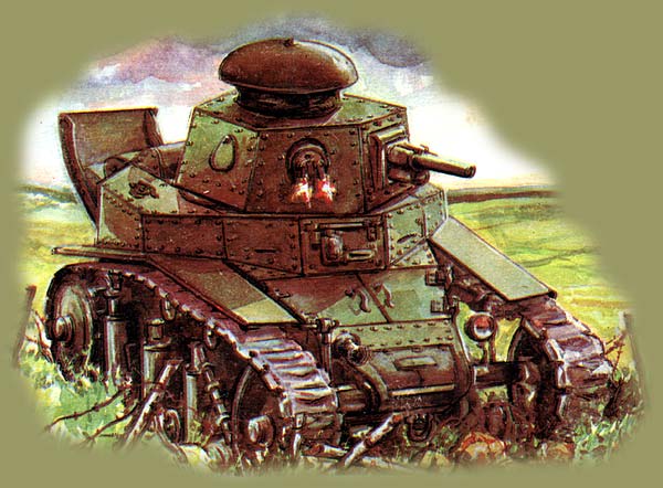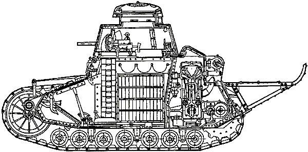 The tank's turret was riveted, and initially had an almost rectilinear six-sided shape with inclined walls. It rested on the sub-turret armor plate through a bearing race and rotated by means of a manual crank. On the back wall of the turret was a backrest, on which was hung a broad strap that the commander used for a seat. The turret was held at the desired position of rotation by three stops spaced equally on the turret ring, two in front and one at the rear. On the roof of the turret was an observation cupola with hatch cover that opened on hinges. Springs were contained in the hinge that helped to open the hatch and a latch was installed to hold it in the open position. Ventilation holes were formed around the perimeter of the hatch base that could be covered when necessary with a sliding circular shield. Observation slits in the vertical walls of the cupola were provided with leather facings to protect the commander's face against bruising, and the cupola itself had a ventilator hole covered by a sliding shield of a teardrop shape where the cupola was joined with the turret roof. The shape of the turret was changed when the tank was modernized. Additional space was added at the rear of the turret for the installation of a radio set. The recess was closed from the back by a folding cover that permitted installation and removal of the radio and weapon (actually, a portion of the ammunition stowage was in this space). The shield for the ventilating portal of the turret became rectangular and now folded upward on hinges. The new turret was 140 kg heavier. The tank's armament, consisting of a 37mm Hotchkiss cannon and machine gun, was located in the forward portion of the turret. The cannon was located on the left side in a rectangular opening and the machine gun on the right side in a ball mounting. When necessary the machine gun could be shifted to a hull opening that was located on the left rear face and covered in normal conditions by an armor plate. |