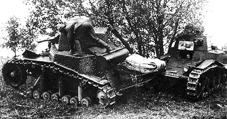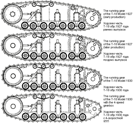 The mobility of this tank was provided by a gasoline four-cylinder, four-stroke, air-cooled engine designed by A. Mikulin, producing 35-40 h.p. In comparison with existing power plants of tanks of that era, it had some peculiarities. For example, ignition was provided by two sets of spark plugs (two spark plugs per cylinder) from a magneto, which ensured that a powerful spark was distributed to each cylinder when the motor was started, and from a dynamo-magneto, which served both for ignition and for supplying the driving lights. The second peculiarity was the unified engine and transmission in a single assembly and the clutch (primarily friction), which was an absolute innovation at that time. And finally, the engine was mounted transversely in the engine compartment, which gave the tank a measurable superiority in weight and length compared to tanks that had a longitudinally mounted power pack. The simple differential was joined to the transmission, on the output shafts of which were mounted gears. Together with drive wheels they comprised the tank's final drive. On tanks of the third series, the output of the engine was increased to 40 h.p., which together with a four-speed transmission enabled the tank to reach a speed of 17.5 kmh. The first production series of tanks were equipped with Bosch electrical systems and tanks produced after 1930 were equipped with Sintilla electrical systems. |